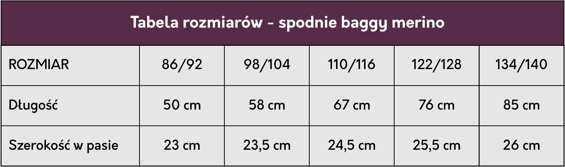 Luźne, dziecięce spodnie typu baggy z regulowanym pasem uszyte z wełny merino o gramaturze 260g/m2. W takim kroju Twoje dziecko będzie mogło bez przeszkód eksplorować świat. Ciemny kolor pozwoli na bezstroską zabawę i jeszcze rzadsze pranie (wełna merynosów jest samoczyszcząca, często, gdy jest to zabrudzenie np. z błota, wystarczy, że poczekamy aż wyschnie a potem zeskrobiemy delikatną szczotką).